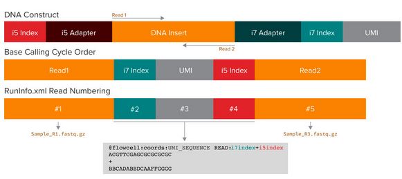 UMI-aware demultiplexing (Manual)Manual demultiplexing requires additional configuration of the BCL2FASTQ run. The read cycles for the UMI occur in between the read cycles for the two indices. BCL2FASTQ can automatically take the first base pairs of read 2 and place them in the FASTQ header as UMIs. So instead of the usual 4 bcl2fastq reads (read1, index1, index2, read2), we set up 5 reads:
