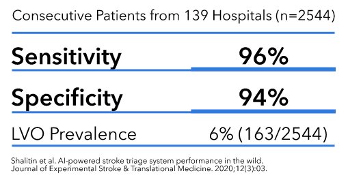 In CTAs from 2,544 consecutive patients across 139 US hospitals using scanners from multiple manufacturers,* Viz LVO has demonstrated 96% sensitivity and 94% specificity identifying LVOs. This is the only peer reviewed data describing the performance of AI powered stroke triage in the real world from any manufacturer.