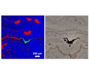 SWIFT ultra fast Raman image of a mineral section, illustrating distribution of quartz species (red/blue) and a haematite seam.