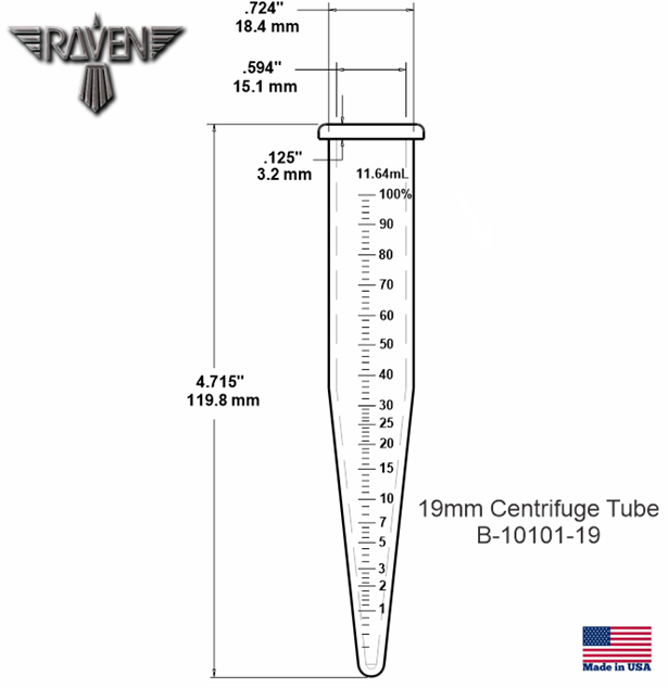 Durable and Reusable Centrifuge Tubes. Conical bottom centrifuge tubes with graduated scale in 0.2% -100% allow very small amounts of solids compacted in the bottom to be measured. Made of durable polycarbonate. The shoulder at the top of the tube hangs in the rotor trunnion rings. These polycarbonate tubes cannot be used with flammables, solvents, or cooking oils. The 19mm tubes are recommended for Raven`s model F-10300 centrifuge. Please verify diameter prior to using in other manufacturers` centrifuges. Sold in packs of 12 tubes.